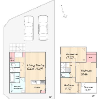 洗面室兼ランドリールームとサンルームがある3LDK新築一戸建て。